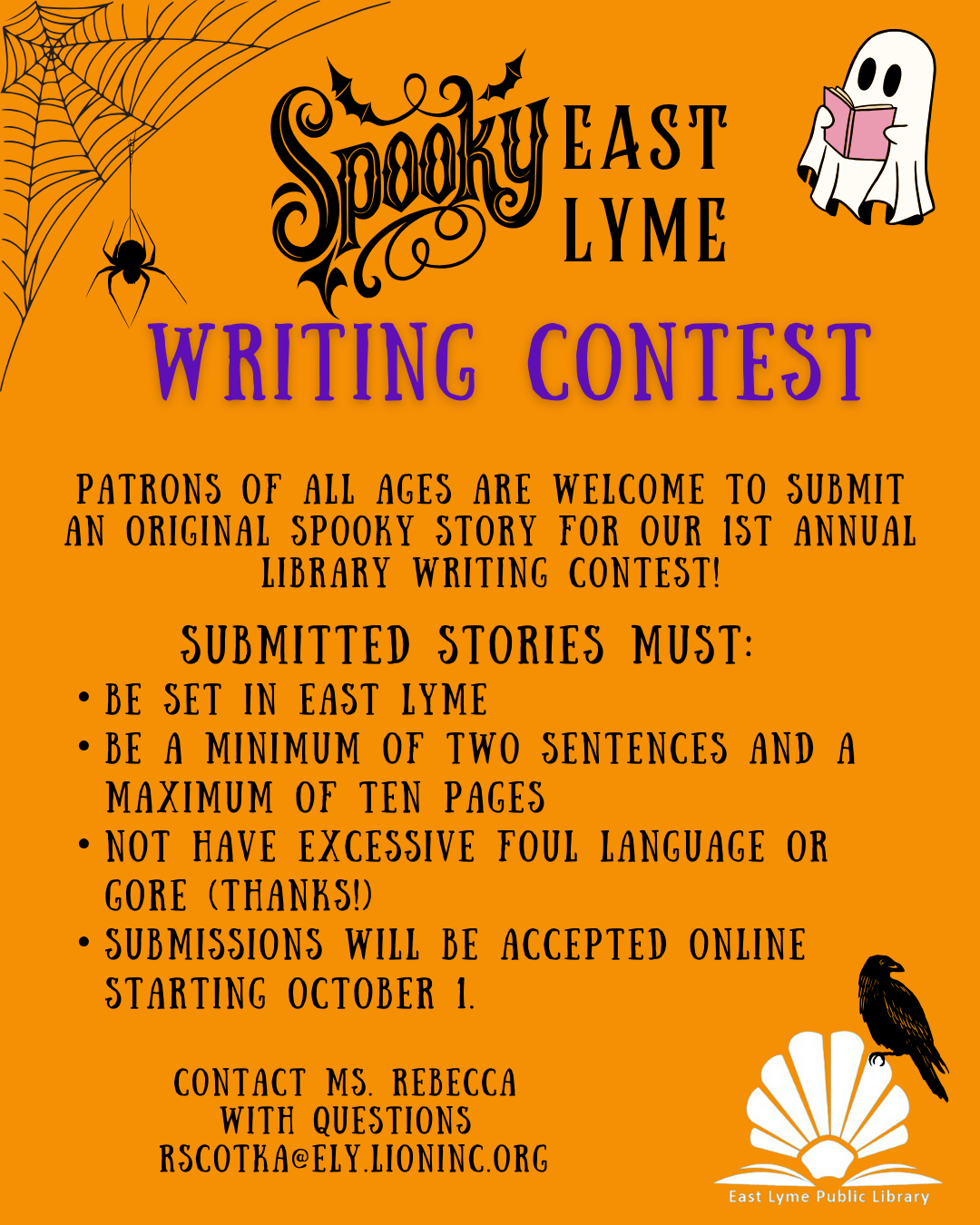 The Library will be creating a bound copy of submissions. The three winning submissions from the East Lyme Public Library will be sent to the statewide contest to be added to the collection "Spooky CT".