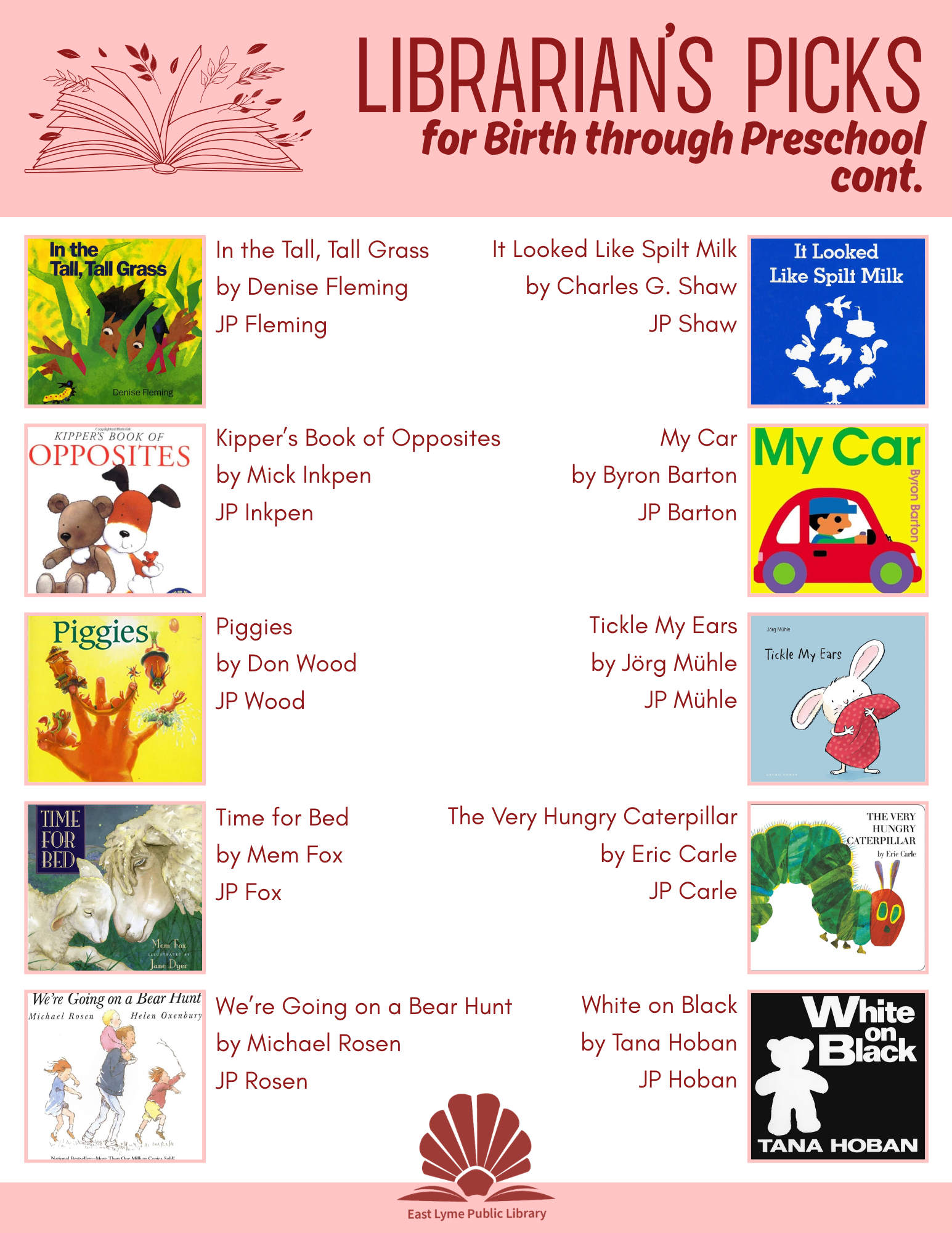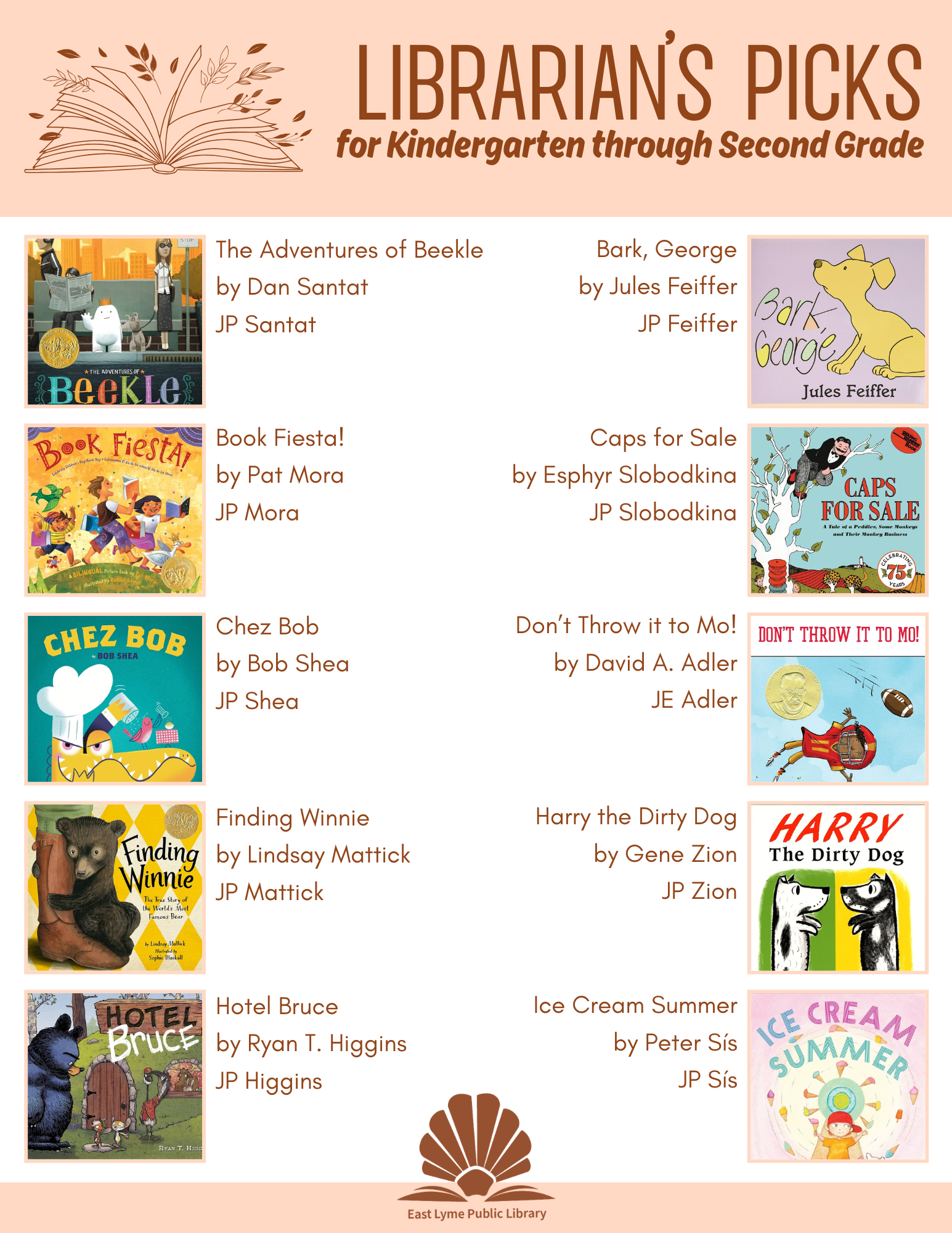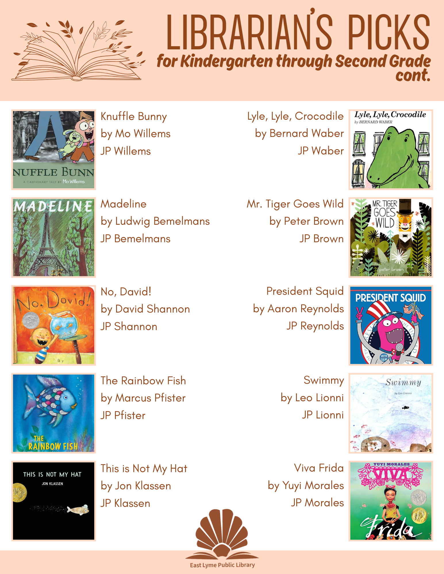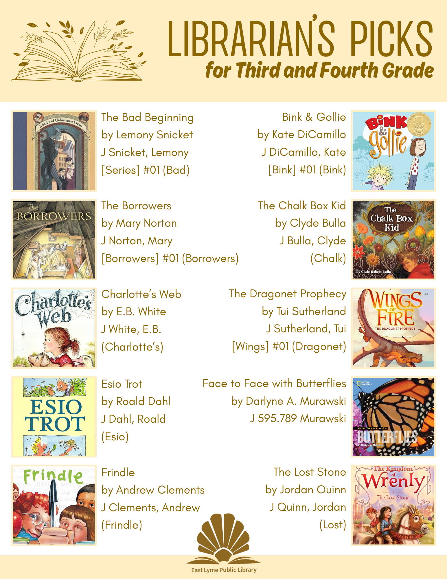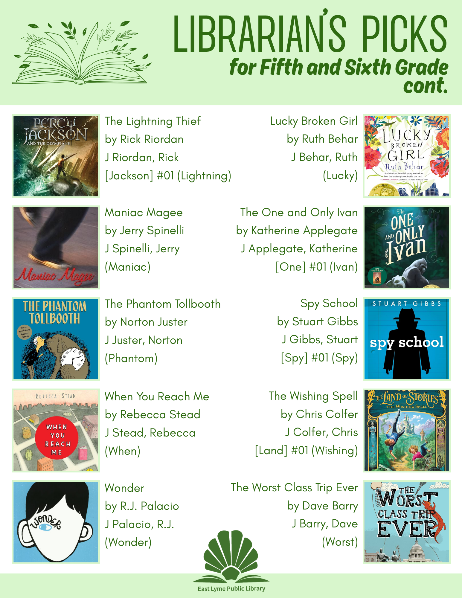 The books in the following lists are just suggestions. I have tried to include books of varying reading levels in each grade category. Not every book is right for every child or every family. The very best way to discover great books is to bring your family to the Library and explore the collection together. Librarians are happy to help you find "just the right book."
